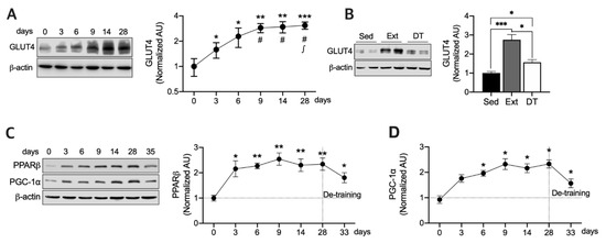 Exercise training (Ext) gradually upregulates glucose transporter type 4 (GLUT4), peroxisome proliferator-activated receptor β/δ (PPARβ), and peroxisome proliferator-activated receptor gamma coactivator 1-alpha (PGC-1α) and increases their stability. (A) GLUT4 protein expression was analyzed in a time-dependent manner at 0, 3, 6, 9, 14, and 28 days of exercise training (n = 6 muscles of rats per group). Values are means ± SE. * p < 0.05, ** p < 0.01, *** p < 0.001 versus day 0. # p < 0.01 versus day 3. ∫ p < 0.05 versus day 6. (B) GLUT4 protein expression was analyzed at 28 days of exercise training and after 5 days of de-training (DT) (n = 6 muscles of rats per group). Sed–Sedentary. Values are means ± SE. * p < 0.05, *** p < 0.001. (C,D). PPARβ and PGC-1α expression were analyzed in a time-dependent manner at 0, 3, 6, 9, 14, 28 of exercise training and 5 days de-training (n = 6 muscles of rats per group). Values are means ± SE. * p < 0.05, ** p < 0.01 versus day 0. All muscles were isolated 24 h after each training session. Significance was determined using one-way ANOVA.