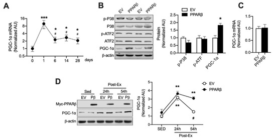PGC-1α is rapidly upregulated by acute exercise and then rapidly reverts to baseline levels upon lack of stimulation [13,14,15] because PGC-1α is rapidly degraded in the nucleus via the ubiquitin-proteasome system (UPS) [16]. We previously reported that PPARβ binds to PGC-1α and blocks PGC-1α ubiquitination [6]. We speculated that Ext-induced PPARβ upregulation can improve PGC-1α protein stability and thus gradually increase protein levels during Ext. We found that Ext upregulated PGC-1α mRNA (approximately 8-fold) (p < 0.001) following a bout of exercise, and that PGC-1α mRNA levels after 6, 14, and 28 days of Ext were significantly decreased (p < 0.05) by approximately 6-fold rather than after acute exercise, although the mRNA levels were significantly higher (p < 0.05) than those in the sedentary state (Figure 3A). This finding is consistent with a report wherein high-intensity exercise upregulated PGC-1α mRNA by over 10-fold after the initial exercise session and then progressively decreased to a 4-fold increase over day 0 after the seventh session [17]. Despite these mRNA levels, the PGC-1α protein levels gradually increased during chronic exercise and displayed an approximately 2-fold increase by day 6 (Figure 1D), indicating that PGC-1α protein expression is regulated by a post-translational mechanism during Ext. PPARβ overexpression does not upregulate PGC-1α in skeletal muscles [18,19]. This finding was confirmed (Figure 3C); however, PPARβ overexpression in myotubes increased PGC-1α mRNA levels [20]. The mechanism underlying these differences between myotubes and skeletal muscles may be explained on the basis of the differences in p-38 MAPK signaling. Therefore, we determined whether PPARβ influences p38 and ATF pathways, since these are upstream factors for PGC-1α transcription [21]. Interestingly, overexpression of PPARβ in skeletal muscles slightly but not significantly reduced the phosphorylation of p-38 MAPK, and no change was observed in ATF2 phosphorylation (Figure 3B). However, PPARβ overexpression resulted in an increase in PGC-1α protein expression (p < 0.05) in the skeletal muscle (Figure 3B). Furthermore, we investigated the effect of PPARβ on PGC-1α protein stability using a different method from that reported previously [6]. Mice were exercised using a swimming program, resulting in a ~2-fold increase in PGC-1α protein expression (p < 0.01) regardless of PPARβ overexpression in their skeletal muscle, indicating that PPARβ did not influence the synthesis of PGC-1α protein upon acute exercise. Fifty-four hours after the exercise, PGC-1α levels reverted to baseline in muscles electroporated with the empty vector (EV) but were maintained at this high level in muscles, wherein PPARβ was overexpressed, indicating that PPARβ inhibited PGC-1α degradation after acute exercise (Figure 3D). These data indicate that PPARβ upregulation induced by Ext can prevent PGC-1α degradation and can increase PGC-1α protein levels in a post-transcriptional manner (Figure 3D), concurrent with our previous report with a different exercise intensity and type [22].