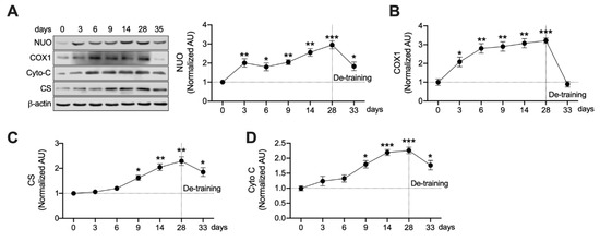 Differences in the normalization rates of mitochondrial proteins. (A,B) NUO and COX 1 are rapidly upregulated by Ext; however, only NUO is stable after 5 days of de-training (n = 6 muscles of rats per each day). Values are means ± SE. * p < 0.05, ** p < 0.01, *** p < 0.001 versus day 0. (C,D) CS and Cyto C are gradually upregulated by Ext and stabilize after 5 days of de-training (n = 6 muscles of rats per each day). Values are means ± SE. * p < 0.05, ** p < 0.01, *** p < 0.001 versus day 0. Significance was determined using one-way ANOVA.