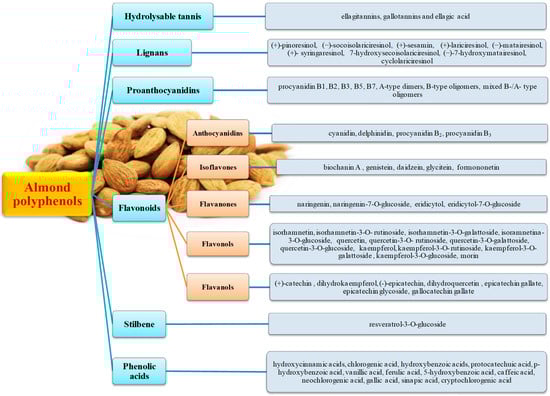 Different classes of flavonoids have been reported in almonds or their coproducts, including flavonols, anthocyanidins (cyanidin), flavanones and flavan-3-ols. Among the flavan-3-ols, (+)-catechin, dihydrokaempferol, and (-)-epicatechin were the most abundant molecules, ranging from 2 to 40 mg/100 g of almond, but, although in minor amounts, dihydroquercetin, gallocatechin gallate, epicatechin gallate and epicatechin glycoside have also been reported [29,40]. Flavonols are, by far, the most abundant flavonoid class in almonds (ranging from 87 to 135 mg/100 g) and include kaempferol, quercetin, isorhamnetin and their 3-O-glucosides, rutinosides and galactosides and morin [41,42]. Isorhamnetin and its derivatives are the most abundant compounds, followed by kaempferol and quercetin derivates. Naringenin and its 7-O-glucoside derivatives are the main flavanones identified in whole almonds (~3 mg/100 g), while eridicytol-7-O-glucoside is present in almond skin and blanch water. Several different phenolic acids and aldehydes (ranging from 5 to 12 mg/100 g) have been reported in whole almonds, such as hydroxycinnamic acids, chlorogenic acid, hydroxybenzoic acids, protocatechuic acid, p-hydroxybenzoic acid, vanillic acid, ferulic acid, 5-hydroxybenzoic acid, caffeic acid, neochlorogenic acid, sinapic acid and cryptochlorogenic acid [43,44]. Limited information is available on isoflavones, lignans and stilbenes, with the identification, in most cases, of aglycone structures, after chemical or enzymatic hydrolysis, but it is possible that these structures are present in the glycosylated forms as well as involved in the formation of more complex structures in the natural matrix. Although some isoflavones have been quantified in whole almonds (~40 μg/100 g), several derivates have been identified by high performance liquid chromatography-mass spectrometry (HPLC-MS) and gas chromatography–mass spectrometry GC-MS, including biochanin A (by far the most abundant derivative ~25 μg/100 g), genistein, daidzein, glycitein and formononetin [45]. Resveratrol-3-O-glucoside is the main stilbene identified and quantified, while, after hydrolysis, a combination of GC-MS and HPLC-MS/MS analysis has led to the identification of the following lignans: (+)-pinoresinol, (−)-socoisolariciresinol, (+)-sesamin, (+)-lariciresinol, (−)-matairesinol, (+)- syringaresinol, 7-hydroxysecoisolariciresinol, (−)-7-hydroxymatairesinol and cyclolariciresinol in a total amount of ~670 μg/100 g [45,46].