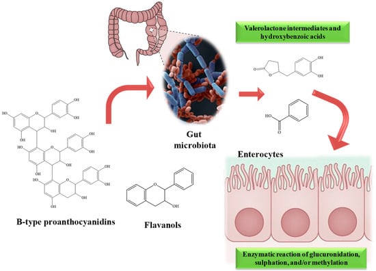 Schematic representation of metabolization processes of flavanols and B-type proanthocyanidins, catalyzed first by gut microbes with the formation of small phenolic compounds and inside the entherocytes by Phase I and II enzymes.