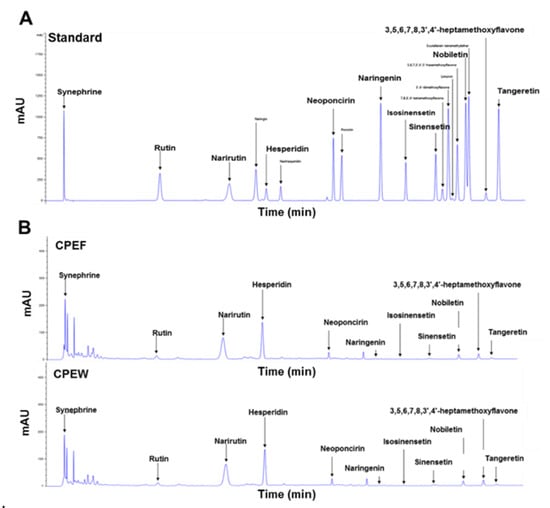 2.3. Quantification of the Main Components of Citrus Peel Extract Using High-Performance Liquid Chromatography with Diode-Array Detection (HPLC-DAD)