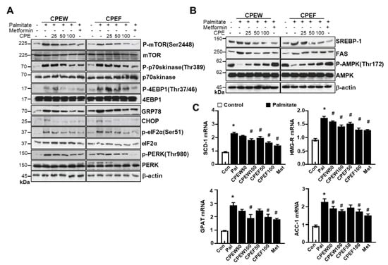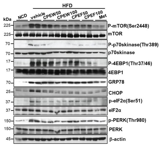 3.4. AMPK Activation in CPEW and CPEF Prevents High-Fat Diet-Induced Hepatic Steatosis through Controlling the mTORC1-ER Stress Pathway