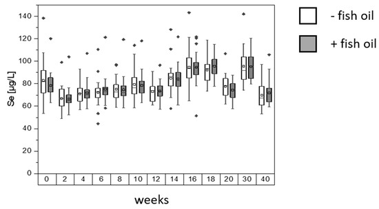 Blood serum of 51 participants of the MoKaRi cohort was analyzed for total selenium (Figure 1). At the beginning of the study, mean of total Se for the - fish oil group was 83.0 ± 19.3 µg/L, with a minimum value at 53.5 µg/L and a maximum value of 138.4 µg/L. The mean of total Se for the + fish oil group was 78.7 ± 12.0 µg/L, with a range from 63.2 to 120.3 µg/L. During the intervention time of 20 weeks, the serum selenium concentrations ranged between 67.0 and 94.7 µg/L for the - fish oil group and between 66.6 and 95.6 µg/L for the + fish oil group. At the end of the intervention, the participants had mean selenium levels of 77.7 ± 10.4 µg/L in the - fish oil group (range: 62.0–106.8 µg/L), while the + fish oil group showed levels of 74.4 ± 7.8 µg/L (range: 57.6–87.6 µg/L). After ten weeks of follow-up (week 30), total serum selenium increased to 95.4 ± 15.8 µg/L for the – fish oil and to 95.3 ± 11.8 µg/L for the + fish oil group. The values dropped for both groups at the end of follow up (week 40): the - fish oil group was at 69.7 ± 12.3 µg/L, whereas the individuals of the + fish oil group were at 71.9 ± 10.7 µg/L.