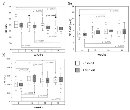 In further experiments, SELENOP concentrations as well as GPx activities have been determined for selected time points, i.e., the beginning of the intervention (0 weeks), at half time (10 weeks), the end of the intervention (20 weeks), and the last follow-up visit (40 weeks). Table 1 summarizes the results of SELENOP and GPx activity measurements in comparison with total Se for the mentioned timepoints, while Figure 2 visualizes these data. For total Se (Figure 2a), SELENOP (Figure 2b), and GPx activity (Figure 2c), no significant differences were found between the - fish oil group and the + fish oil group. However, statistically significant time-dependent changes between the visits were observed. Mean SELENOP increased during the intervention period in both groups, reaching its highest level at the end of the intervention with 5.9 ± 0.9 mg/L for the – fish oil group (week 0 vs. week 20: p = 0.0008) and 5.7 ± 1.2 mg/L for the + fish oil group (week 0 vs. week 20: p = 0.0021). The follow-up visit after 40 weeks revealed a slight decline in mean SELENOP to 5.7 ± 1.2 mg/L for the - fish oil group and 5.5 ± 1.3 mg/L for individuals supplemented with fish oil. The behavior of increases and decreases for mean SELENOP was not consistent for all individuals, as can be taken from the minimum and maximum values (Table 1, ranges).
