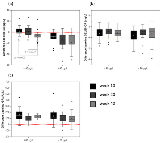 When dissecting the cohort into two groups based on the initial serum Se content (< 80 µg/L and > 80 µg/L), a clear pattern can be identified for differences in serum Se content compared to baseline values (Figure 4a). A serum Se content of 80 µg/L was chosen as a cut-off because this is the concentration presently defined to optimize serum selenoprotein concentrations [10]. In the course of the study, the serum Se concentrations showed a trend for a decrease in the group with high initial serum Se (mean: 92.9 ± 14.4 µg/L; week 10 vs. week 40: p = 0.0854). In the group with low initial serum Se (mean: 71.7 ± 7.5 µg/L) a decline was only identified in the follow-up (40 weeks; week 10 vs. week 40: p = 0.0003). Consequently, the number of individuals with < 80 µg/L serum Se increased during the study. After 10 weeks of intervention, six participants dropped below 80 µg/L Se. At the end of the intervention (20 weeks), nine individuals and, for the follow-up, eventually 11 individuals had serum Se concentrations of lower than 80 µg/L. For the group with initially low serum Se concentrations, four participants showed > 80 µg/L serum Se after 10 weeks and, after 20 weeks, there were six individuals with more than 80 µg/L serum Se. This effect was reversible as, in the follow-up, the serum Se concentrations fell back again to < 80 µg/L. In contrast to serum Se values, there were no differences between SELENOP concentrations (Figure 4b) or serum GPx activity (Figure 4c) in comparison to their baseline values or between the groups with baseline Se serum values below or above 80 µg/L.