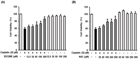 To analyze the protective effects of 3DC2ME isolated from Z. jujuba root extract, LLC-PK1 cells were pre-treated with varying concentrations of 3DC2ME for 2 h (12.5, 25, 50, 100, and 200 μM) and then, treated with 25 μM cisplatin for 24 h. N-acetyl cysteine (NAC) was used as the positive control. The cell viability was then measured using the Ez-Cytox cell viability assay. As shown in Figure 2A, treatment with cisplatin alone resulted in cell viability of 58.96% ± 3.96%. Cell viability was increased to 85.53% ± 2.16% and 85.49% ± 4.29% by 200 μM 3DC2ME and 500 μM NAC, respectively. These results indicated that 3DC2ME showed a better protective effect at a lower concentration than NAC (positive control). When treated with 3DC2ME alone, the cell viability was over 90% at all concentrations. Accordingly, we used 100 and 200 μM of 3DC2ME for further experiments.