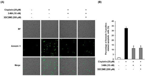 Reduction of apoptosis after treatment of autophagy inhibitor 3-MA and 3DC2ME in LLC-PK1 cells exposed to 25 μM cisplatin for 24 h. (A) Images acquired for quantitative measures of apoptosis and (B) percentage of annexin V-positive-stained apoptotic cells. Control cells were treated with vehicle only (mean ± SD, * p < 0.05 compared to control). 3-MA, 3-methyladenine; SD, standard deviation.