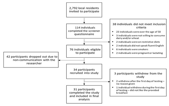 Residents from the Burwood (Melbourne, VIC, Australia) area near the Deakin University Burwood campus who had previous signed up to the CASS Food Research Centre Consumer Database (n = 2792) were invited via email to participate in this study. The invitation email contained a screener questionnaire to determine eligibility. Individuals were eligible to participate if they were aged between 18 and 50 years, were able to attend four laboratory testing sessions in the CASS lab at Deakin University, were willing to fast overnight prior to each testing session, and were willing to consume milk and wheat products for breakfast. Individuals were excluded from recruitment if they were allergic or intolerant to wheat or dairy, were smokers, were non-fluent in English, were pregnant or lactating, were on a diet that restricted energy consumption, and/or had an illness or condition that precluded them from fasting overnight (e.g., diabetes mellitus). One hundred and fourteen individuals completed the screener questionnaire, 76 of them met eligibility criteria, 42 dropped out due to non-communication with the researcher, and 34 were recruited into the study (Figure 1).
