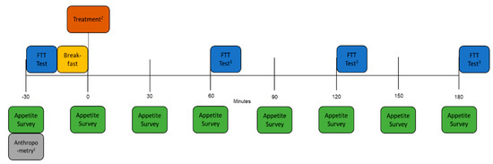 Following the initial FTT measure, participants were provided with a breakfast that consisted of WeetBix (Sanitarium, Berkeley Vale, NSW, Australia) and fat-free skim milk (Devondale, Melbourne, VIC, Australia) at a ratio of 26 g of WeetBix per 100 g of milk, based on the manufacturer’s serving recommendations. Participants had the option of having their milk served warm. Participants were required to consume the provided breakfast in full within a 15 min period.