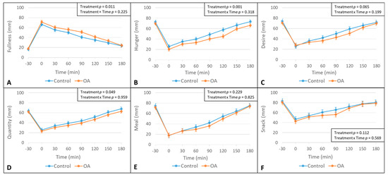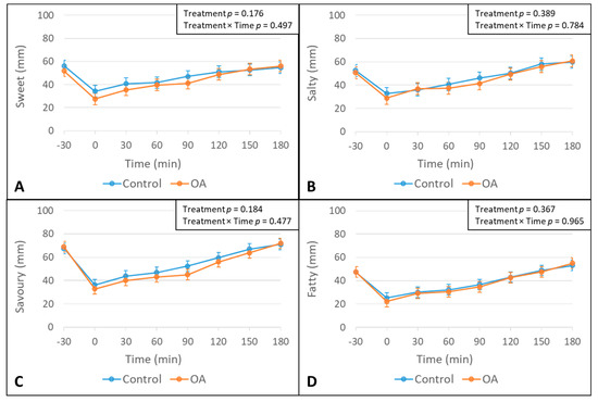 There was a significant effect of the treatment on fullness, hunger and quantity ratings, where overall fullness ratings were greater and overall hunger and quantity ratings were lower following the OA treatment, as compared to the control treatment (Figure 3). However, no significant treatment × time interactions were observed for any of the appetite ratings (Figure 3) and desires to eat foods of a specific taste (Figure 4).