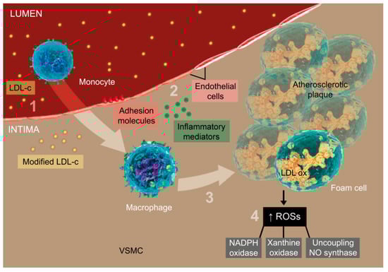 Representation of the atherosclerotic process adapted from Glaudemans et al. [40]. (1) Migration of LDL-c to the endothelial wall and its modification; (2) Uptake of the circulating monocytes by endothelial cells and VSMCs; (3) Transformation of monocytes into foamy macrophages from the uptake of LDL-c by scavenger receptors; (4) Increase of ROS and oxidation of LDL-c. Abbreviations: LDL-c: Low-density lipoprotein cholesterol; LDL ox: Oxidized LDL-c; VSMC: Vascular smooth muscle cells; ROS: Reactive oxygen species; NO: Nitric oxide.