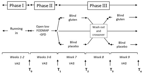 The run-in phase (phase 1, two weeks) aimed to assess basal symptoms while on a FODMAP-gluten-containing diet; only symptomatic patients progressed to the open diagnostic phase following a balanced normocaloric low FODMAP-GFD for a period of four weeks (phase 2: T0–T1). At the end of phase 2, the modification of symptoms was evaluated as reported by Catassi et al. [] using a VAS score reduction of ≥30% as a significant response. In the presence of a VAS score reduction of ≥30% at the end of low FODMAP-GFD, the challenge phase (phase 3: week 7–9) was offered. Patients with a VAS score reduction <30% were considered “non-responders” and discontinued the trial.