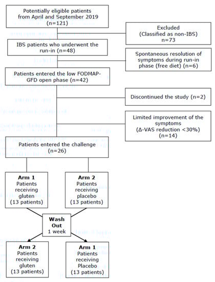 This study aimed to achieve a definitive diagnosis of NCGS in IBS patients. For this purpose, all subjects received a low FODMAP diet combined with a GFD (low FODMAP-GFD), and those presenting an improvement of symptoms during this dietary treatment were exposed to a double-blind challenge with gluten or placebo.