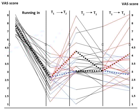 Graphical representation of the VAS score changes from the beginning to the end of the study. Black continuous lines refer to the phases with low FODMAP-GFD and red and blue continuous lines correspond to the gluten and rice challenge, respectively. The ends of each dotted line represent the mean of the VAS values obtained at the beginning and the end of each phase of the study.