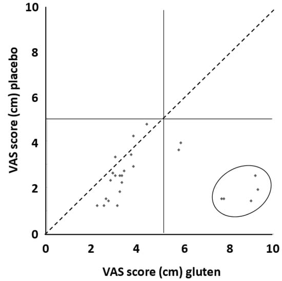 Distribution of patients according to their VAS score while on gluten and placebo. Patients closer to the diagonal dashed line had a similar response to gluten and placebo. The two patients located in the lower right square but not included in the ellipse experienced a mild degree of the overall response. Patients included in the ellipse had a significant increase in VAS score ≥5.0 cm after gluten challenge (for the calculation of this value refer to the “Materials and Methods” section). The risk of symptom worsening after gluten assumption was increased by five times (95% CI 0.63 to 39.91) compared to placebo, although such a difference did not reach statistical significance. The absolute risk difference was 15% (95% CI − 1% to 32%).