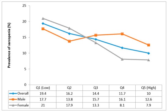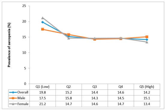 For vegetable consumption, only a slight drop in the prevalence of sarcopenia was observed between Q1 and Q2 with the prevalence between Q2 and Q5 being almost equal in the overall and sex-stratified samples (Figure 2).