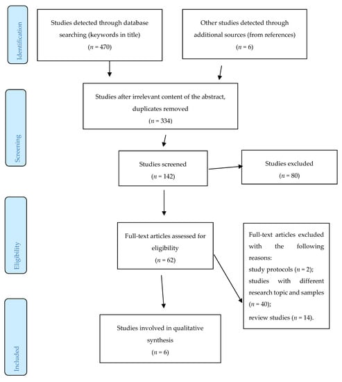 Altogether, 470 titles/abstracts were detected by using the collocation words described above from the database/journal searches. The majority of articles were found in Web of Science (297 studies). In PubMed, 173 studies were found. Another six articles were detected from additional sources, most often from the references of the identified studies. After removing duplicates and titles/abstracts unrelated to the research topic, 142 English-written studies remained. Of these, only 62 articles were relevant for the research topic. These studies were investigated in full and they were considered against the following inclusion and exclusion criteria. The inclusion criteria were as follows: