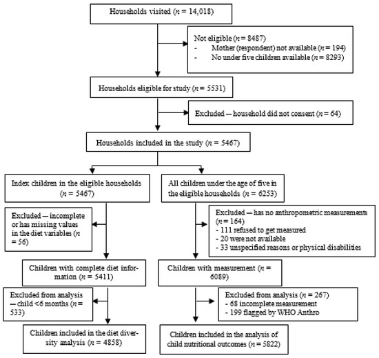 - Chandrasekhar, S.; Aguayo, V.M.; Krishna, V.; Nair, R. Household food insecurity and children’s dietary diversity and nutrition in India. Evidence from the comprehensive nutrition survey in Maharashtra. Matern. Child Nutr. 2017, 13, e12447. [Google Scholar] [CrossRef] [PubMed]