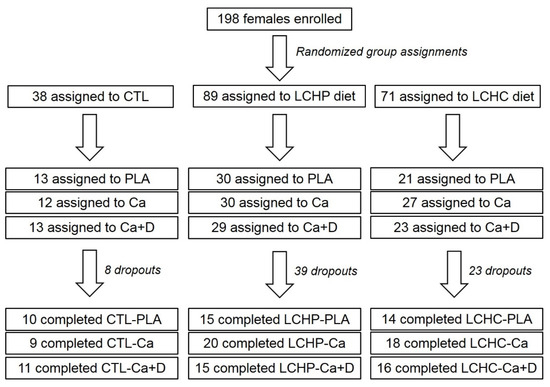 CONSORT diagram. CTL represents the control (no diet, exercise only) group, LCHP represents low calorie—high protein diet, exercise group, LCHC represents low calorie—high carbohydrate, exercise group, PLA represents placebo supplementation, exercise group, Ca represents calcium supplementation, exercise group, Ca+D represents calcium plus Vitamin D supplementation, exercise group.