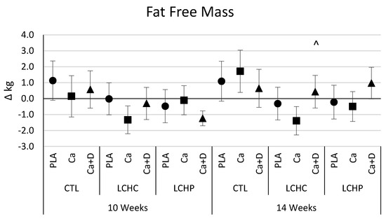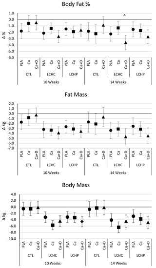 Body mass and composition changes from baseline (mean [95% CI]) observed for the placebo (PLA or ●), calcium (Ca or ■), and calcium + Vitamin D (Ca+D or ▲) groups. CTL represents the control (no diet, exercise only) group, LCHP represents low calorie—high protein diet, exercise group, LCHC represents low calorie—high carbohydrate, exercise group, PLA represents placebo supplementation, exercise group, Ca represents calcium supplementation, exercise group, Ca+D represents calcium plus Vitamin D supplementation, exercise group.† represents p < 0.05 difference between PLA and Ca groups. ^ represents p < 0.05 difference between Ca and Ca+D groups.