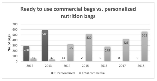 Historically, parenteral nutrition was administered in separate bottles containing a carbohydrate solution, an amino acid hydrolysate, and a lipid emulsion together with vitamins and trace element vials. Over the last few decades, all-in-one (three-in-one) admixture (AIO) systems for parenteral nutrition have become available [1,2]. The use of these systems prevents component manipulation, thereby reducing the probability of contamination. This method requires only one intravenous access, lowering the risk of infection. A recent literature review showed that the use of all-in-one admixtures had significant advantages regarding rates of bloodstream infections and therefore length of stay [3]; a summary of these studies is shown in Table 1. AIO systems provide simpler prescriptions, save time, and reduce workload and costs [4]. In a paper published by Pichard et al., a significant reduction in preparation time was shown throughout all levels of manpower, including the physician’s prescription, the nurse’s administration and preparation, and the pharmacist’s compounding total parenteral nutrition (TPN). In total, 25 min was spent using the separated bottle system compared to 11 min for the AIO system [5]. There are two types of AIO systems, namely, personalized compound bags which are prepared in hospitals or industry pharmacies, and “ready-to-use” commercial bags. Personalized compound bags were designed to meet the nutritional needs of the patient in relation to specific clinical conditions. When using a “ready-to-use” commercial bag, patient-specific nutritional requirements must be considered, therefore, despite the advances in AIO commercial bags, many clinical centers worldwide still prefer personalized compound bags [6]. It is important to note that not all centers have a skilled pharmacist for compounding TPN, a problem which can be eliminated by using AIO commercial bags. A recently conducted observational study in our center reported a dramatic decrease in the use of personalized compound bags since 2014 [7] (see Figure 1). This decrease was possible when using electrolyte-free formulas, as well as a large variety of volume bags (1, 1.5, 2.0, and 2.5 L). This allowed the use of a partial bag if desired and the addition of electrolytes depending on the patient’s recent lab results. All additions to commercial bags, including vitamins and trace elements, are performed according to the manufacturer’s recommendations, thereby maintaining the stability of the formula.
