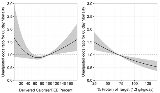 Association of administered caloric/resting energy expenditure (Adcal/REE) percent according to 60-day mortality (left) and protein intake by daily requirement (1.3g/kg/day), with 60-day mortality (right) presented using the odds ratio. REE: Resting energy expenditure. Reprinted from Critical Care 2016, 20, 367. “Resting energy expenditure, calorie and protein consumption in critically ill patients: a retrospective cohort study”. Permission was obtained from the authors; © 2019 Copyright by Zusman et al.