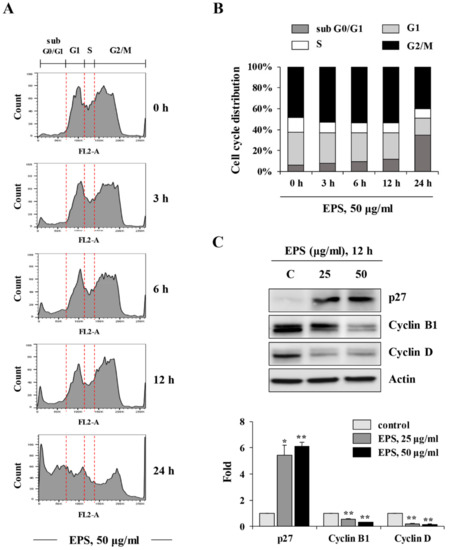 EPS induces cell cycle arrest at the G2/M phase in hiPSCs. (A,B) hiPSCs were incubated with 50 µg/mL EPS for 3, 6, and 12 h, and then cell cycle distribution was analyzed using flow cytometry after staining intracellular DNA with propidium iodide (PI) solution. (C) The levels of cell cycle-related proteins in hiPSCs were measured by Western blotting after treating with indicated concentrations of EPS for 12 h. Relative band intensities compared with EPS-untreated control hiPSCs were calculated using Image J software after normalization to actin expression. * p < 0.05 and ** p < 0.01 vs. EPS-untreated control.