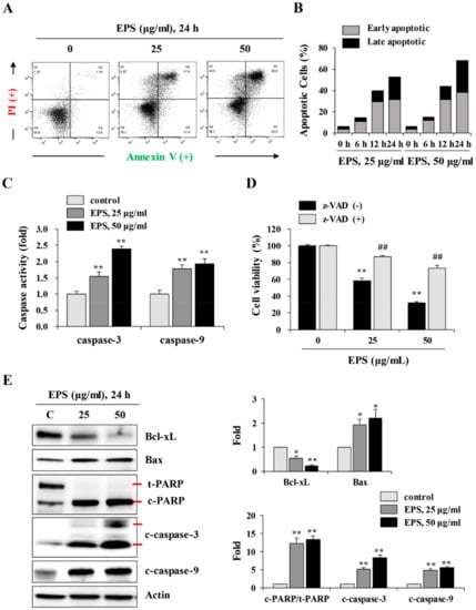 To investigate the mechanism of EPS-induced cell death, EPS-treated hiPSCs were analyzed by flow cytometry after annexin V/propidium iodide double staining. EPS treatment at 25 and 50 µg/mL for 24 h gradually increased the percentages of annexin V-positive apoptotic cells, by approximately 35% and 53.1%, respectively, compared to untreated control hiPSCs (13.8%; Figure 3A). Early apoptotic cells (annexin V+/PI-) were remarkably increased from 6 h post-treatment with EPS, and late apoptotic cells (annexin V+/PI+) were significantly increased by EPS from 12 h, leading to approximately 21% and 30% positive cells using 25 and 50 µg/mL EPS for 24 h, respectively (Figure 3B). To examine the role of caspases in EPS-induced apoptosis, we measured caspase-3 and -9 activities. Figure 3C shows that caspase activities were significantly enhanced by EPS treatment in a dose-dependent manner (caspase-3: F = 152.0, p < 0.0001; caspase-9: F = 46.34, p = 0.0002; one-way ANOVA). In addition, pretreatment with z-VAD, the pan-caspase inhibitor, considerably blocked EPS-induced cell death (Figure 3D). EPS treatment also decreased the protein level of anti-apoptotic Bcl-xL, increased the level of pro-apoptotic Bax, and cleaved PARP in a dose-dependent manner. The increases in cleaved active forms of caspase-3 and -9 were also confirmed by Western blot analysis (Figure 3E).