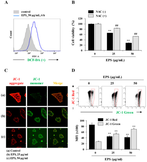 Under stress conditions, intracellular ROS production and loss of MMP (Δψm) participate in the caspase-induced intrinsic apoptosis pathway [20,21]. Therefore, we evaluated the effect of EPS on ROS production and MMP by flow cytometry and immunofluorescence staining. As shown in Figure 4A, EPS remarkably increased intracellular ROS levels by approximately 2.71-fold at 6 h post-treatment using 50 µg/mL of EPS. In addition, pretreatment with NAC, the ROS scavenger, effectively blocked EPS-induced cell death (Figure 4B). We next determined the mitochondrial damage caused by EPS using the fluorescence JC-1 dye, which accumulates in mitochondria. In cells with high MMP, JC-1 was observed in a red aggregated form, whereas it appeared as a green monomeric form in cells with low MMP levels [22]. As shown in Figure 4C, fluorescence microscopy revealed that the EPS induced a significant loss of MMP. During flow cytometry, the percentage of cells with low MMP was remarkably increased by EPS, in a dose-dependent manner. EPS treatment at 50 µg/mL decreased the mean fluorescence intensity (MFI) of JC-1 red by about half and increased that of JC-1 green 2.6-fold compared to EPS-untreated control cells (Figure 4D; JC-1 red: F = 86.43, p < 0.0001; JC-1 green: F = 155.5, p < 0.0001; one-way ANOVA).
