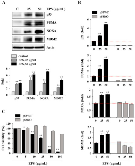 EPS induces p53-dependent apoptosis in hiPSCs. (A) hiPSCs treated with EPS (25 and 50 μg/mL) for 24 h were subjected to Western blotting. The levels of p53, PUMA, NOXA, and MDM2 were determined and the relative band intensities compared with EPS-untreated control hiPSCs were calculated using Image J software. (B) After treating p53 wild-type (p53WT) and p53 knockout (p53KO) hiPSCs with indicated concentrations of EPS for 12 h, the mRNA levels of p53-dependent genes (p21, PUMA, NOXA, and MDM2) were measured by real-time PCR analysis. Data are expressed as the mean ± SD from triplicate samples and represented as fold increases relative to that of EPS-untreated p53WT hiPSCs. (C) p53WT and p53KO hiPSCs were seeded on 24-well culture plates and treated with the indicated concentrations of EPS for 24 h. Cell viability was measured using the CCK-8 and relative cell viability compared with EPS-untreated control hiPSCs was calculated. Data are expressed as the mean ± SD from triplicate samples. * p < 0.05 and ** p < 0.01 vs. EPS-untreated control.