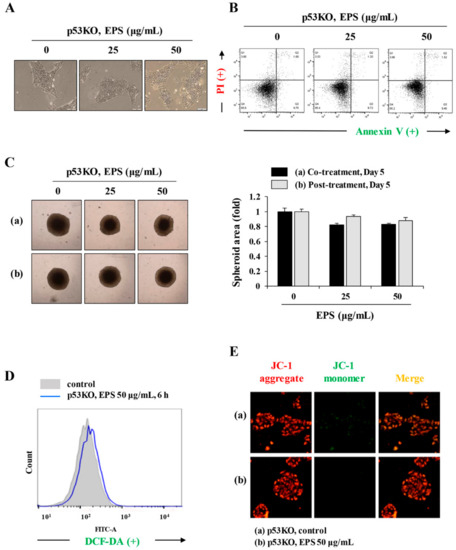 EPS shows no cytotoxicity in p53KO hiPSCs. (A) p53KO hiPSCs were treated with 25 and 50 µg/mL EPS for 24 h and the cell morphology was observed under an inverted microscope. (B) After treatment with EPS, apoptosis in p53KO hiPSCs was assessed with annexin V/PI double staining. (C) p53KO hiPSCs assembled to spheroids were incubated in the presence or absence of 25 and 50 µg/mL EPS from day 0 (a) or day 2 (b). After 5 days, spheroids were photographed and relative spheroid areas were determined using Image J software. Data are expressed as the mean ± SD from triplicate samples. (D) p53KO hiPSCs treated with 50 µg/mL EPS for 6 h were incubated with DCF-DA (5 µM) for 30 min, and then analyzed intracellular reactive oxygen species (ROS) levels using flow cytometry. (E) p53KO hiPSCs were treated with 50 µg/mL EPS for 6 h, stained with JC-1 dye, and observed under a fluorescence microscope.