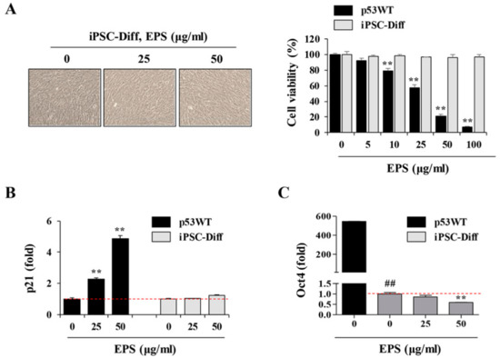 EPS has no cytotoxic effects on hiPSC-derived differentiated cells. (A) iPSC-Diff and p53WT hiPSCs were seeded on 12-well culture plates and treated with 25 and 50 µg/mL EPS for 24 h. Cell morphology was observed under an inverted microscope and cell viability was assessed by CCK-8 assay. Data are expressed as the mean ± SD from triplicate samples. (B,C) After treating iPSC-Diff with indicated concentrations of EPS for 12 h, the mRNA levels of p21 and Oct4 were measured by real-time PCR analysis. Data are expressed as the mean ± SD from triplicate samples and represented as fold increases relative to that of EPS-untreated cells. (D) iPSC-Diff were treated with 25 and 50 µg/mL EPS or 0.2 and 0.5 µM doxorubicin (doxo) for 24 h. The protein levels of p-ATM and p-H2AX were detected by Western blotting. The relative band intensities compared with EPS- or doxo-untreated control cells were calculated using Image J software after normalization to actin expression. Data are representative of two independent experiments. (E) iPSC-Diff and p53WT hiPSCs were treated with 50 µg/mL EPS or 0.5 µM doxo for 24 h or 3 h, respectively, and then immunostained with anti-p-H2AX antibody followed by Alexa 594-conjugated anti-rabbit antibody. Nuclei were stained with DAPI and γ-H2AX foci was observed under a fluorescence microscope. (F) Hepatic markers in p53WT and hiPSC-derived hepatocytes were analyzed by qPCR. Fold increase over p53WT was expressed as the mean ± SD from triplicate samples. Hepatocytes and embryonic bodies (EBs) were treated with 25 and 50 μg/mL EPS for 24 h. Morphological changes were observed under inverted microscope and the Oct4 mRNA level was determined by real-time PCR analysis. Data are expressed as the mean ± SD from triplicate samples and represented as fold increases relative to that of EPS-untreated iPSC-Diff. ** p < 0.01 vs. EPS-untreated control, ## p < 0.01 vs. p53WT.