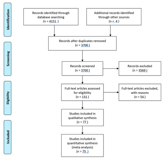 We identified 4151 records from the search of multiple databases. After title and abstract screening and removal of duplicates, 131 studies were selected for full text screening. After full-text screening, 69 studies were excluded, and 77 studies were accepted for inclusion in the review. Four articles were also added from cross referencing of included studies. Of the 77 studies [20,21,22,23,24,25,26,27,28,29,30,31,32,33,34,35,36,37,38,39,40,41,42,43,44,45,46,47,48,49,50,51,52,53,54,55,56,57,58,59,60,61,62,63,64,65,66,67,68,69,70,71,72,73,74,75,76,77,78,79,80,81,82,83,84,85,86,87,88,89,90,91,92,93,94,95,96,97], 38 were on breastfeeding education interventions [21,22,23,24,25,26,27,29,32,33,37,38,39,42,44,49,51,53,54,56,57,58,63,65,66,67,68,70,73,75,81,83,87,88,91,93,94], 28 were on complementary feeding [20,28,30,31,34,43,46,48,55,60,61,62,64,69,71,72,74,76,77,78,79,80,82,85,92,93,95,96] and 12 investigated supplementary feeding interventions. The last search was carried out on 15 April 2019.