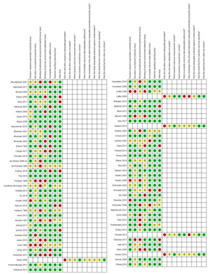 Traffic light plots presenting the risk of bias found in studies. Red circles represent a high risk of bias, green dots represent a low risk of bias and yellow dots represent an unclear risk of bias.