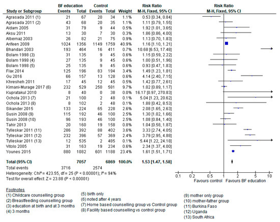 We conducted the following subgroup analyses where there were at least three studies in each sub-group, in adherence with Cochrane collaboration recommendations. Subgroups were divided by setting (home-based, facility-based or community-based), timing of intervention (prenatal, postnatal or a combination), duration of intervention (less than or equal to six months or greater than six months), observer (self-reported or clinically observed outcomes), moderators (community health worker (CHW)/volunteers or healthcare professionals) and by training of personnel (with WHO or United Nations International Children’s Education Fund (UNICEF) materials or from other sources) for breastfeeding education studies. Complementary feeding and supplementary feeding studies were subgroup analyzed by the level of food security of their settings using information available in the full texts of the articles. Sensitivity analyses were also performed to consider the impact of the following: high risk of bias in allocation concealment methodology, high risk of attrition bias due to lost participants and differences in outcomes due to different methods of calculating cluster adjustment