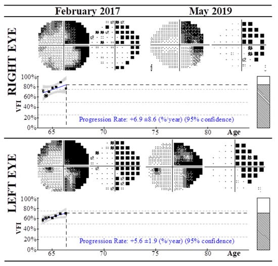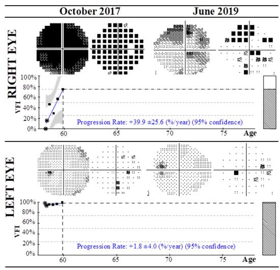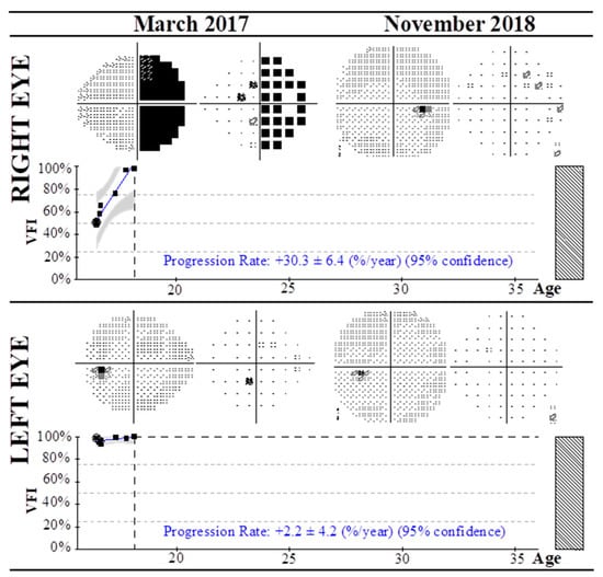 Specifically, VFI evolution of the RAO01 case (patient diagnosed with CRAO) from October 2017 to June 2019 is summarized in Figure 3. In 2017 the patient presented a VFI of 98% in the non-affected left eye, while this index reached 0% in the affected right eye without any sign of vision. The patient was then treated with CoQ10 and vitamin supplementation, and after nine months of follow-up the patient experienced pronounced improvement of VFI to 75% in the right eye (see Table 4). The VFI progression rates per year reached +39.9 ± 25.6 and +1.8 ± 4.0 in the right and left eyes, respectively.