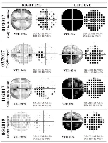 This observation is crucial, since the natural history of visual field recovery is fundamental when evaluating claims of improvement by potential treatments of vascular diseases affecting the retina []. We demonstrate that discontinuing treatment, with worsening VFI, and rechallenging it, with remarkable improvement in the visual field, supports the role of CoQ10 as a therapeutic agent for vascular diseases affecting the retina. Moreover, since the interruption of CoQ10 decreases the visual field, it may suggest that the beneficial effects are not irreversible, but this observation needs further confirmation.
