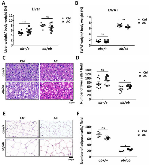 AC may suppress lipid accumulation and deposition in the liver and EWAT in ob/ob mice. (A,B) Percentage of liver or epididymal white adipose tissue (EWAT) weight were normalized to body weight after ob+/+ and ob/ob mice were fed with or without AC for 4 weeks. (C,E) The liver and EWAT were examined using hematoxylin and eosin staining. (D,F) The number of liver or EWAT cells per field was estimated using the ImageJ software. Magnification, 100×. Scale bars are 20 μm for the liver and 50 μm for EWAT. All data are expressed as mean ± SEM, * p < 0.05, ** p < 0.01, *** p < 0.001. Non-significant; ns. n = 4–14 mice in each group.