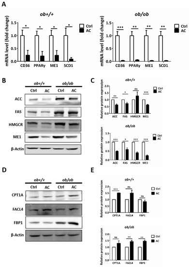 AC reduces hepatic lipogenesis and increases gluconeogenesis by regulating related-genes or protein in ob+/+ and ob/ob mice. (A) The relative mRNA expression of CD36, PPARγ, ME1, and SCD1 were compared between ob+/+Ctrl or ob/ob-Ctrl mice. (B,D) Immunoblot analysis of proteins involved in lipogenesis, β-oxidation, and gluconeogenesis. (C,E) Quantification of protein expression and comparison between ob+/+-Ctrl and ob/ob-Ctrl mice. All data are expressed as mean ± SEM, * p < 0.05, ** p < 0.01, *** p < 0.001. Non-significant; ns. n = 4–8 mice in each group. All experiments were repeated thrice.