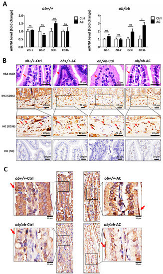 The intestine is at the front line of absorbing nutrients and lipids and the intestinal barrier integrity and permeability are thought to be involved in certain chronic inflammatory diseases such as inflammatory bowel disease (IBD), obesity, and other metabolic disorders [25]. Previously, AC was shown to produce an anti-obesity and anti-inflammatory effect by maintaining intestinal integrity in DIO mice; moreover, CD36 deletion in endothelial cells of the small intestine resulted in impaired barrier function of the small intestinal in mice [11,26]. We found that CD36 expression was restored in the small intestine of ob/ob mice and unaffected in ob+/+ mice, after AC treatment (Figure 5A). Levels of tight junction proteins, like zonula occludens-1 (ZO-1) and zonula occludens-2 (ZO-2), that maintain intestinal permeability were unchanged. However, the level of occludin (Ocln) was slightly increased in ob+/+ or ob/ob mice fed with AC, after four weeks (Figure 5A). Moreover, H&E staining showed increased intestinal barrier integrity in ob/ob mice fed with AC than ob/ob mice not fed AC (Figure 5B). We also examined CD36 and ZO-1 localization in the intestine using IHC. AC restored CD36 expression in endothelial cells (Figure 5B). Moreover, AC promoted ZO-1 localization in intestinal epithelial cells in ob/ob mice compared to ob/ob-Ctrl (Figure 5C). Thus, AC repairs the intestinal barrier by up-regulating CD36 expression, redistributing ZO-1, and reducing intestinal permeability in ob+/+ and ob/ob mice.