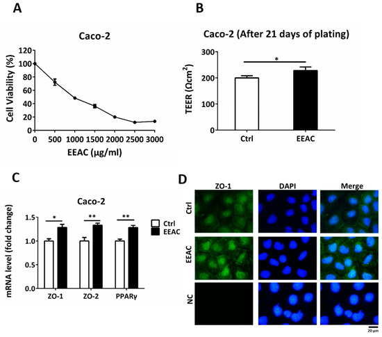 EEAC decreases intestinal permeability in the Caco-2 cell barrier model. (A) Cell viability assay of Caco-2 cells treated with 0-3000 μL/mL EEAC. (B) Effect of EEAC on intestinal permeability was measured using the trans-epithelial electrical resistance (TEER) assay. (C) Relative mRNA expression of tight junction proteins and PPARγ were compared using controls (Ctrl). (D) Immunofluorescence staining of ZO-1 (green) of Caco-2 cells treated with or without EEAC. Nuclei were stained with DAPI (blue). The negative control is marked as NC. Scale bars, 20 μm. All data are expressed as mean ± SEM, * p < 0.05, ** p < 0.01, *** p < 0.001. Non-significant; ns. All experiments were repeated thrice (n = 3).