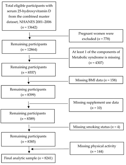 Participants >19 years old from NHANES 2001–2002, 2003–2004, and 2005–2006 were included in this study. These 3 data sets were combined into one master data set, NHANES 2001–2006. A total of 13,642 participants had measured circulating 25(OH)D concentrations. Of those, ≈51% men and ≈49% women. The mean age of the study population was ≈51 years old. The mean BMI was ≈28 kg/m2. After excluding pregnant women (n = 778) and subjects with missing data for at least one component of MetS status (n = 4307), BMI (n = 158), consumption of supplements (n = 10), smoking status (n = 4), and physical activity (n = 144), the final analytic sample was 8241, yielding the weighted population size of 1,214,884,618. This sample formed the basis for the analysis of the association between 25(OH)D and MetS prevalence (Figure 1).
