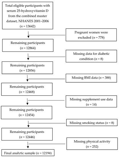 Sample size for the assessment of association between serum 25(OH)D concentration and diabetes risk was 12,194 (weighted population size of 182,793,002). The initial sample for this analysis was 13,642 participants with reported serum 25(OH)D concentrations for the combined 3 cycles of NHANESs (2001–2006). Of those, 1448 subjects were sequentially excluded to derive the analytic sample. These were pregnant women (n = 778) and missing participant data for diabetic condition (n = 8), BMI (n = 388), consumption of supplements (n = 14), smoking status (n = 8), and physical activity (n = 252) (Figure 2).