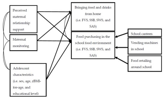 First, descriptive analyses were conducted to provide information about the sample and the frequency at which adolescents purchased food and drinks in their school food environment or brought these products from home. The second set of analyses existed of statistical tests to assess whether demographic factors relevant to the adolescent (i.e., sex, age, zBMI-for-age, and educational level) were associated with the frequency at which adolescents purchased and brought food and drinks. We conducted t-tests to assess sex differences, and ANOVAs with Games-Howell post-hoc comparisons were conducted to test differences between educational levels. Moreover, bivariate correlations for age and zBMI-for-age were conducted to assess whether these factors predicted any differences in the frequency to which adolescents purchased or brought food and drinks. These analyses were performed with SPSS version 24.0 (IBM Corp., Armonk, NY, USA). Finally, Structural Equation Modelling (SEM) in Mplus 8.0 was conducted [] to assess whether maternal monitoring and relationship support were associated with the frequency of purchasing or bringing food and drinks. The latter existed of a latent variable constructed from the three contexts in which adolescents could purchase their food and drinks (i.e., school canteen, vending machines in school, or at food retailers outside the school). The model was estimated for all food categories simultaneously, i.e., FVS, SSB, SWS, and SAS. In a second model, we controlled for adolescents’ age, sex, zBMI-for-age and educational level. The model fit was assessed using the comparative fit index (CFI) and the Root Mean Square Error of Approximation (RMSEA). The CFI relates to the total variance accounted for by the model, where values close to 1, i.e., higher than 0.95, are considered adequate []. The RMSEA is based on the non-centrality parameter, where fit values of <0.06 are considered adequate. Full information maximum likelihood (FIML) procedures were used to account for missing data (e.g., in zBMI-for-age). We also report the Standardized Root Mean Square Residual (SRMR). Alpha was set at p < 0.05. See Figure 1 for the conceptual model of these analyses. The data that support the findings of this study are available from the corresponding author, upon reasonable request.