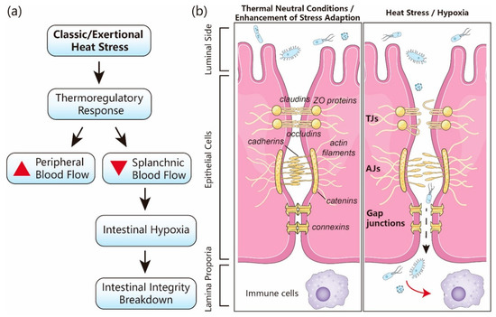 The sequence of events leading to heat stress-induced intestinal barrier damage. Hyperthermia induced by environmental or exertional heat stress (HS) stimulates the thermoregulatory mechanisms. (a) In the whole body, the thermoregulatory response shifts the splanchnic blood flow to the peripheral blood circulation, resulting in hypoxia in intestines and intestinal barrier dysfunction. (b) At the cellular level, hyperthermia leads to disruption of intestinal epithelial integrity, mainly by affecting the tight junctions (TJs) and adherens junctions (AJs), which are responsible for sealing the paracellular space between adjacent cells. Damage to TJs and AJs facilitates the transfer of luminal toxins and pathogens (light blue bodies) through the epithelial barrier into the lamina propria, harboring numerous immune cells that are activated and contribute to the exaggeration of the inflammatory reactions, which may further worsen the intestinal damage. ZO: zonula occludens protein.