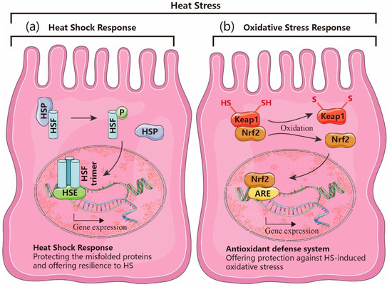 Schematic illustration of the heat stress (HS)-induced heat shock response and oxidative stress response. (a) Cells under HS conditions activate the heat shock response pathway, which is initiated by translocation and trimerization of heat shock factor-1 (HSF1) into the nucleus, where it binds to the regulatory heat shock elements (HSE) in the promoter regions of heat shock protein (HSP) genes. (b) Oxidative stress induced by HS results in the liberation of nuclear factor erythroid 2 related factor 2 (Nrf2) from Kelch-like ECH-associated protein 1 (Keap1) and the translocation of Nrf2 into the nucleus where it binds to the antioxidant response element (ARE) in the promotor region of antioxidant target genes, driving their expression.