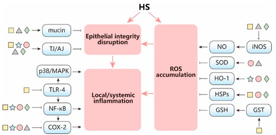 As depicted in Figure 3, the described nutritional substances have a broad range of effects on HS-induced intestinal integrity disruption, inflammation, and oxidative stress. Nutritional substances, which have the potency to preserve not only cellular homeostasis by enhancing non-specific cellular defense systems, but also maintain intestinal integrity, are considered as promising feed/food supplements to protect animals and humans against the adverse effects of HS.