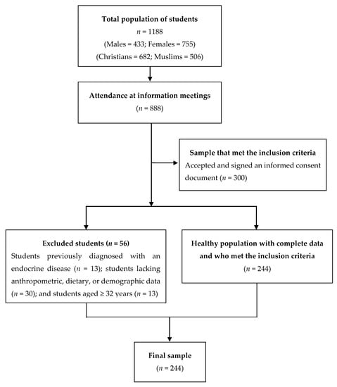 Information meetings were scheduled and held for all students (n = 1188) during September 2013 at the university campus of Melilla. Of the 1188 students, only 888 attended all meetings. At the meetings, participants learned about the different evaluations and questionnaires that they would have to complete to participate in the study. An informed consent form with a description of the study was given to all students attending the meetings. After applying the previously mentioned inclusion criteria, 300 students were selected for the study. However, 56 were subsequently excluded because of one of the following reasons: (i) previous diagnosis of an endocrine pathology (n = 13); (ii) incomplete anthropometric, dietary, or demographic data (n = 30); (iii) age ≥32 years (n = 13).