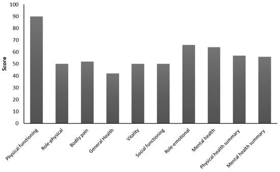 General descriptions of eight sub-scales and the two summary scores (physical and mental health) for the study population are shown in Figure 1. The highest median value was observed for physical functioning (score = 90), while the lowest for general health perception (score = 42).
